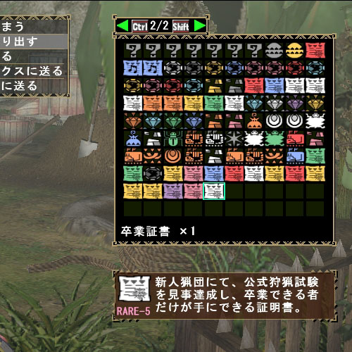 さてHR10になって試験も終了し新人猟団卒業ですよ。 どこか良い猟団が見つかるといいなぁ。 そいや卒業したときにもらえる卒業証書ってなにか使い道ないのですかねぇ?